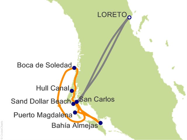 Below is a selection of locales we may visit during our expedition. Bahia Almejas: The southernmost of the waters we'll explore, Bahia Almejas, or Bay of Clams, is known for its many seabird species and its remarkably active gray whale populations. With luck, we'll have the opportunity to view a large frigatebird colony before heading out on a whale-watching trip. Board small, open boats called pangas, operated by pangueros-expert local guides. The areas around Magdalena Bay are primarily supported by whale-watching and small-scale, artisanal fishing; our pangueros make their livings as fishermen outside the gray whale season and have a deep familiarity with these rich waters. Isla Magdalena / Sand Dollar Beach: Explore ever-shifting sand dunes on a cross-island walk to one of the most pristine beaches in the Pacific. Take in the impressive desert plant life of this exotic terrain, home to five species of cacti. Tally treasures offered up by the ocean on the aptly named Sand Dollar Beach, and capture images of your discoveries with the help of a certified photo instructor. Puerto Magdalena: Wake up anchored at this small fishing village, surrounded by the open Pacific to the west, Magdalena Bay to the east, mangroves to the north, and mountains to the south. With a population of 85, Puerto Magdalena is the only inhabited area of Isla Magdalena. Meet a local resident and learn how his family has lived off the area since the 1800s-from lichen harvesting to managing an open-air cantina, where we'll enjoy local bites and beverages. Time permitting, visit the desalinization plant that supplies fresh water to the community. Get active on a fat-tire bike ride or, conditions permitting, a kayaking excursion through the mangroves in Man of War Cove. Hull Canal: Take in the scenery and watch for pods of bow-riding dolphins as we navigate this winding canal. Within its narrow channels, bordered by mangroves and sand dunes and filled with abundant wildlife, we join our keen-eyed naturalists on deck to spot species and hear expert commentary. Weather permitting, explore the vast mangrove system by kayak and Zodiac. Bird-watching can be excellent here, with various seabirds and shorebirds patrolling the beaches as they fatten up and prepare for long journeys to their summer breeding grounds. We might see anything from diving pelicans and wheeling cormorants to terns, great blue herons, ibis, whimbrels, and willets. Boca de Soledad: Settle in for unforgettable experiences in this tranquil lagoon. Each winter, during their long migration, gray whales travel south from their Arctic feeding grounds to breed and give birth to their calves in these sheltered waters, often called "Grand Central" for California gray whales. Venture out in local pangas to view the numerous mother-calf pairs that thrive in the region. With luck, enjoy up-close interactions with these curious creatures. ...