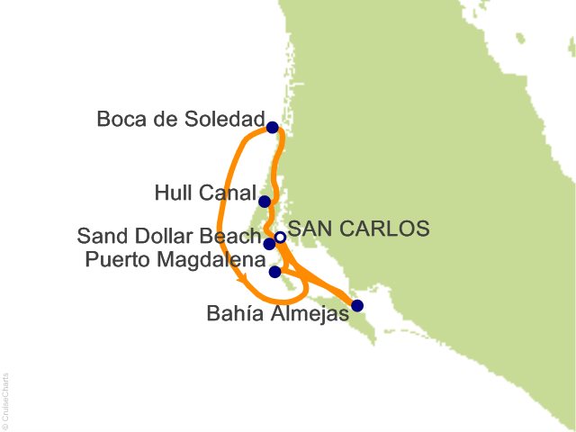 Below is a selection of locales we may visit during our expedition. Bahia Almejas: The southernmost of the waters we'll explore, Bahia Almejas, or Bay of Clams, is known for its many seabird species and its remarkably active gray whale populations. With luck, we'll have the opportunity to view a large frigatebird colony before heading out on a whale-watching trip. Board small, open boats called pangas, operated by pangueros-expert local guides. The areas around Magdalena Bay are primarily supported by whale-watching and small-scale, artisanal fishing; our pangueros make their livings as fishermen outside the gray whale season and have a deep familiarity with these rich waters. Isla Magdalena / Sand Dollar Beach: Explore ever-shifting sand dunes on a cross-island walk to one of the most pristine beaches in the Pacific. Take in the impressive desert plant life of this exotic terrain, home to five species of cacti. Tally treasures offered up by the ocean on the aptly named Sand Dollar Beach, and capture images of your discoveries with the help of a certified photo instructor. Puerto Magdalena: Wake up anchored at this small fishing village, surrounded by the open Pacific to the west, Magdalena Bay to the east, mangroves to the north, and mountains to the south. With a population of 85, Puerto Magdalena is the only inhabited area of Isla Magdalena. Meet a local resident and learn how his family has lived off the area since the 1800s-from lichen harvesting to managing an open-air cantina, where we'll enjoy local bites and beverages. Time permitting, visit the desalinization plant that supplies fresh water to the community. Get active on a fat-tire bike ride or, conditions permitting, a kayaking excursion through the mangroves in Man of War Cove. Hull Canal: Take in the scenery and watch for pods of bow-riding dolphins as we navigate this winding canal. Within its narrow channels, bordered by mangroves and sand dunes and filled with abundant wildlife, we join our keen-eyed naturalists on deck to spot species and hear expert commentary. Weather permitting, explore the vast mangrove system by kayak and Zodiac. Bird-watching can be excellent here, with various seabirds and shorebirds patrolling the beaches as they fatten up and prepare for long journeys to their summer breeding grounds. We might see anything from diving pelicans and wheeling cormorants to terns, great blue herons, ibis, whimbrels, and willets. Boca de Soledad: Settle in for unforgettable experiences in this tranquil lagoon. Each winter, during their long migration, gray whales travel south from their Arctic feeding grounds to breed and give birth to their calves in these sheltered waters, often called "Grand Central" for California gray whales. Venture out in local pangas to view the numerous mother-calf pairs that thrive in the region. With luck, enjoy up-close interactions with these curious creatures. ...