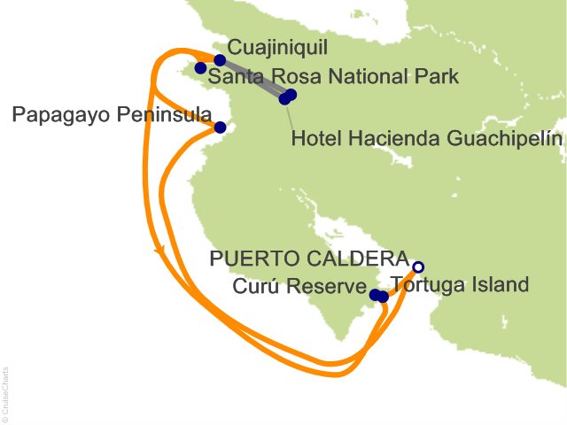 Along the coast of the Nicoya Peninsula, and in many ways demarcating the line between the wetter jungles of the south and Guanacaste's drier environment, sits Curu National Wildlife Refuge, Costa Rica's first private national wildlife reserve. Learn about the hundreds of species of birds, reptiles, and mammals that inhabit this thriving ecosystem while exploring the park's tracks and trails. Look for white-faced capuchin monkeys, turquoise-browed motmots and with luck, scarlet macaws. The northern tamandua resides here, and while often elusive and quiet, this primarily arboreal member of the anteater family may be spotted. Later, as you enjoy lunch onboard, you'll cruise to a cluster of offshore islets collectively called Isla Tortuga. Relax on the beach shaded by swaying palms and tropical vegetation, then celebrate the finale of your Guanacaste adventure with afternoon refreshments and hors d'oeuvres on the beach. ...
